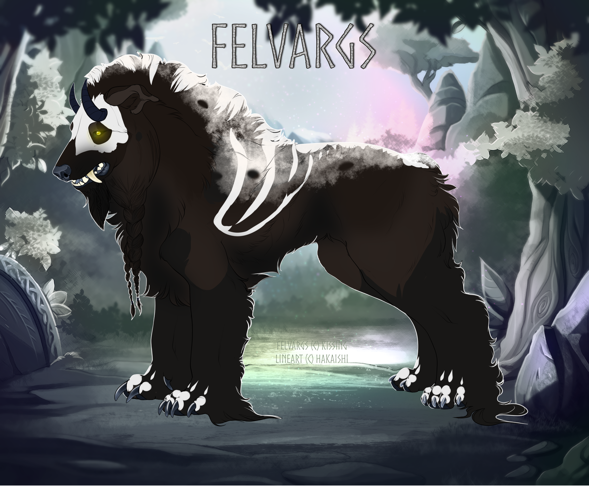This girl is dark and mysterious. No one knows much about her or where she came from, but what they do know is, she's scary looking. Her outward appearance doesn't really reveal her true nature though. She's by no means a brute, but she's also not a pushover either. She enjoys the outdoors and is often seen exploring the dark parts of the world either by herself or with companions; she'll explore with either, it doesn't make much difference to her. She enjoys both the company of others and also her alone time to herself. She's a very strong felvarg and enjoys wrestling with the males when she's got the opportunity. There's really nothing girly about this lady. She's semi friendly and tends to have a slight twisted sense of humor. Not everyone can handle being around her for too terribly long. But if you can get past her rough outward appearance you'll find a loyal and devoted friend in her. She finds making friends a not so easy feet though, due to her scary appearance, which tends to make her slightly angry at times. But every once in a while there's the one who doesn't let it phase them, and get to know her. She's very tough and is a talented and skilled hunter as well as a decent fisher when she can get over herself long enough to get in the water. She's not a fan of getting her pelt wet as its fairly thick in some places so it takes a long time to dry. Due to this, she doesn't bathe as often as one likely should and tends to stay slightly dirty and smelly.
